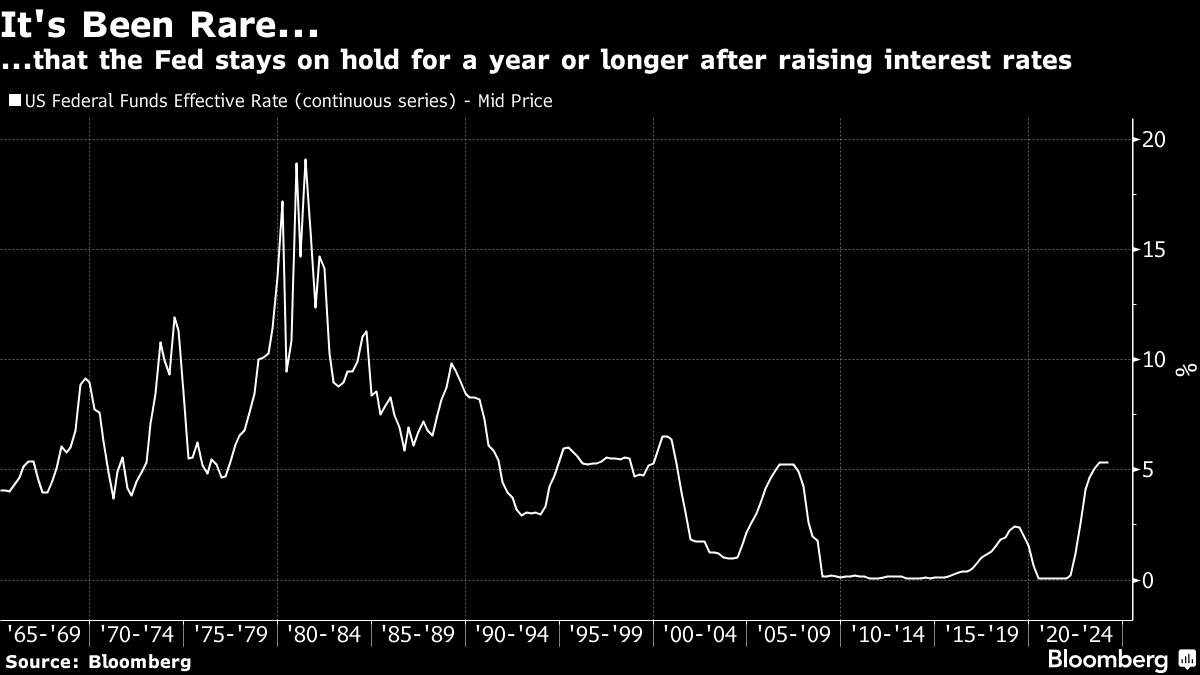 长达一年以上保持利率不变在历史上很罕见。对于风险资产来说,升息的累积影响可能会对经济造成打击,危及人们渴望的软着陆,因为利率对消费者和企业造成了影响。这种影响仍需要时间才能显现,所以这并不是市场的直接关切。但这是一个应该让多头保持警惕的尾部风险。