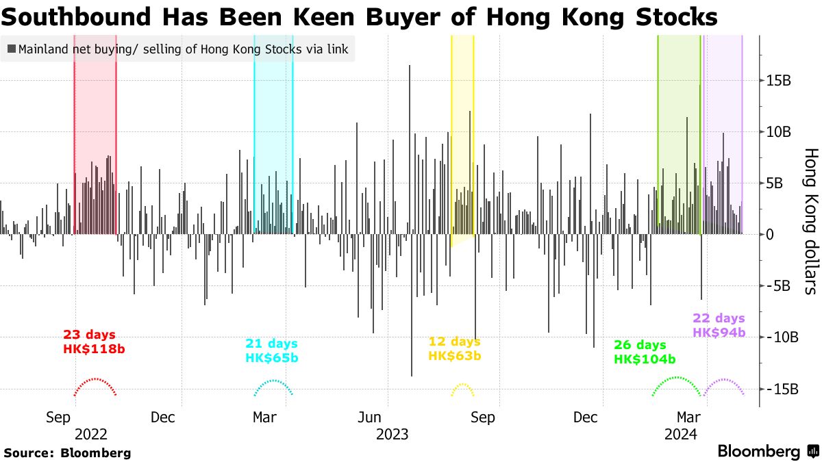 南向交易商多年来一直稳定地充当着砍价猎人的角色,有时也会成为动量追逐者。他们今年购买了2130亿港元(270亿美元)的香港股票,约占去年总额的三分之二,截至周二已连续22个交易日向香港净流入资金。