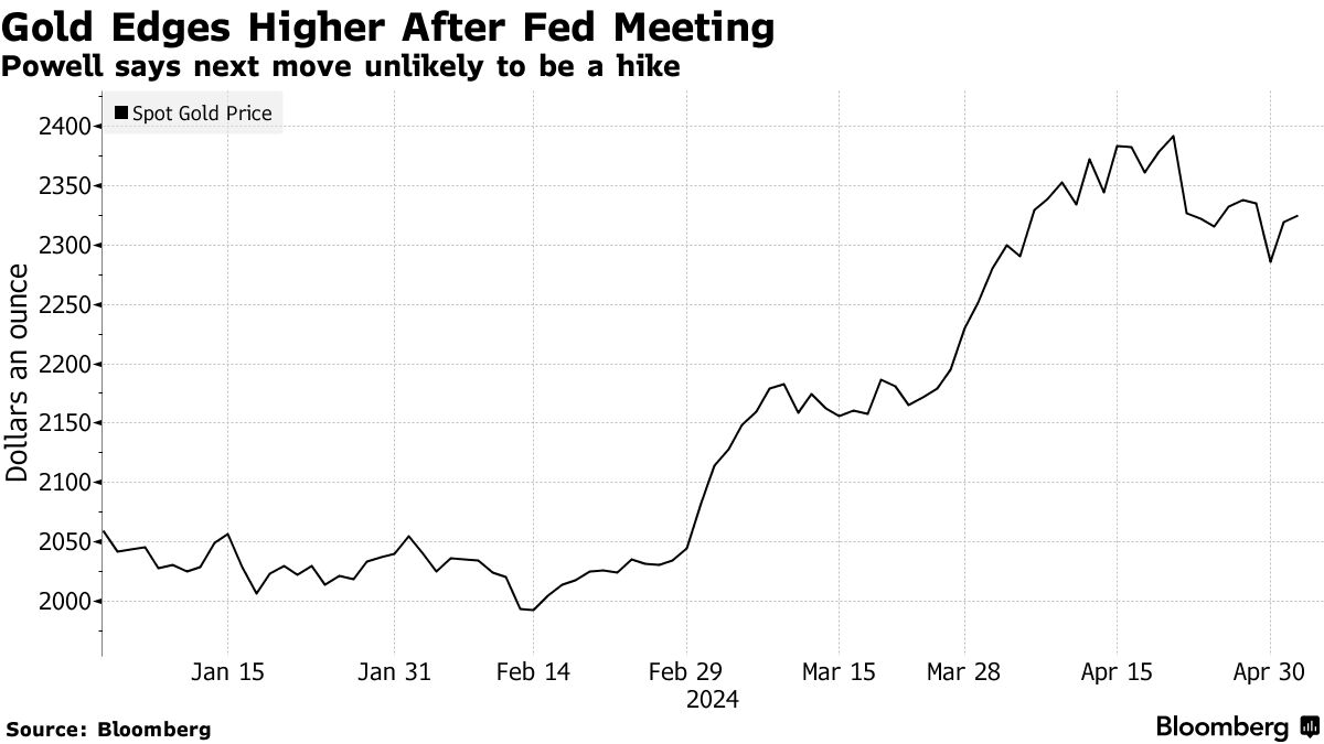 黄金在亚洲早盘交易中上涨至每盎司2,330美元,此前一日上涨1.5%,为4月中旬以来最大单日涨幅。周三,美国国债收益率暴跌,支撑了黄金,因美联储主席杰罗姆·鲍威尔淡化了加息可能性,尽管他重申需要更多证据表明价格上涨正在减缓,然后才会降低借贷成本。