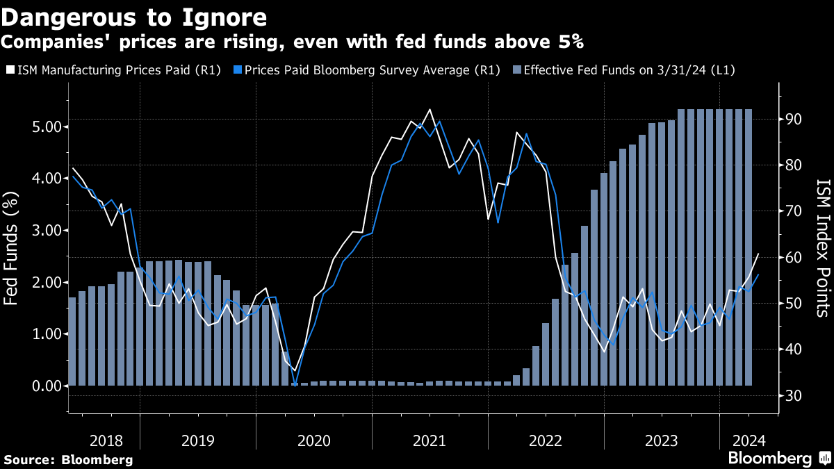 在数据方面,每个月初总是有大量数据。周三又是那种令人恼火的日子,你可以挑选数据来支持几乎任何假设。供应管理协会的制造业调查糟糕透了,整体指数再次跌破50,意味着收缩而不是扩张。最令人担忧的是公司支付的价格调查,事后证明这是2020年和2021年通胀压力的一个很好的领先指标,而当时利率保持在零利率。现在,这一指数已经意外地跃升至两年来的最高水平: