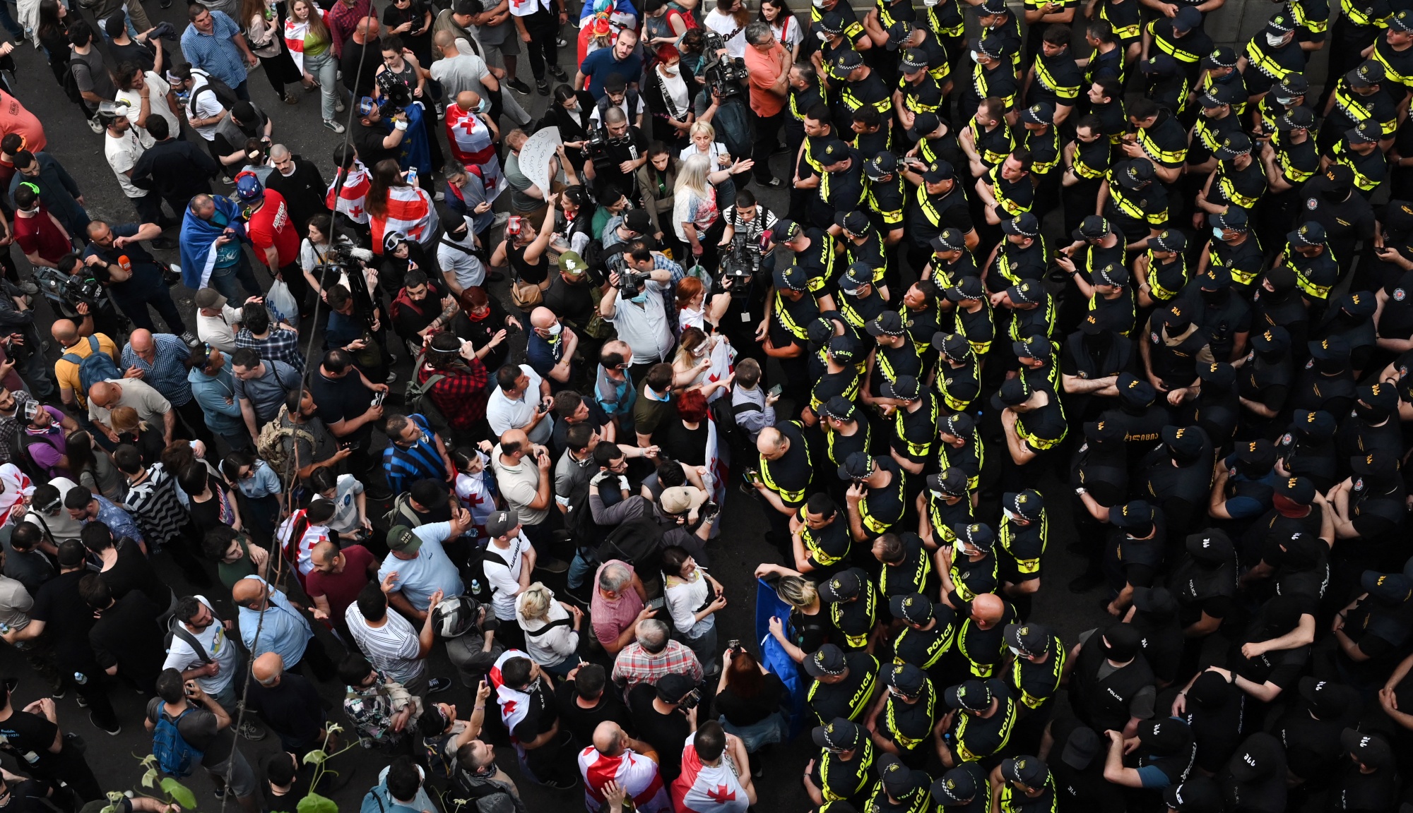 示威者在5月1日在第比利斯的格鲁吉亚议会外面面对警察。