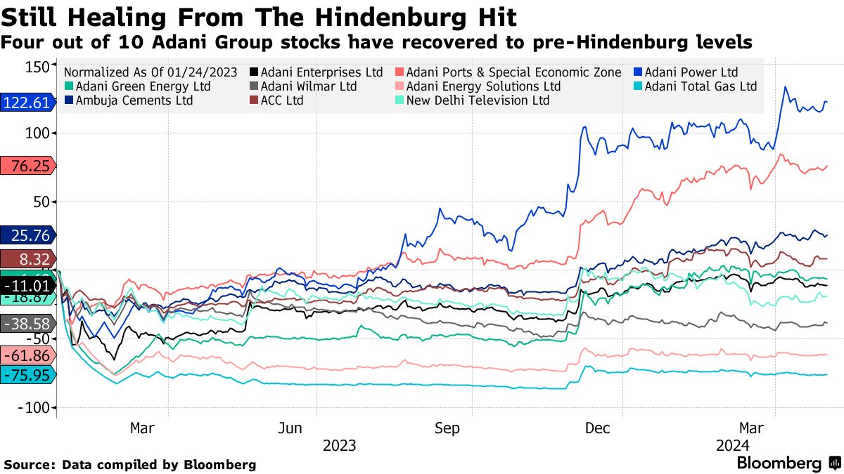 阿达尼企业的股票在三月季度上涨了12.2%,过去一年上涨了约58%,但仍未触及兴登堡事件前的水平。这对大多数其他集团公司也是如此。