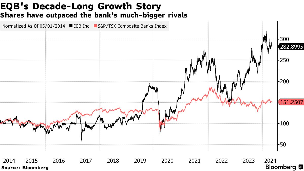 Equitable Bank 现在是加拿大第七大贷款机构,它通过瞄准其他竞争对手回避的企业而实现了这一成就。该公司的数字账户产品EQ Bank最近在奥斯卡和超级碗期间由《舒特小镇》的父子档尤金和丹·莱维在电视广告中进行了推广。收入迅速增长,甚至在去年意外赢得了一笔收购交易。