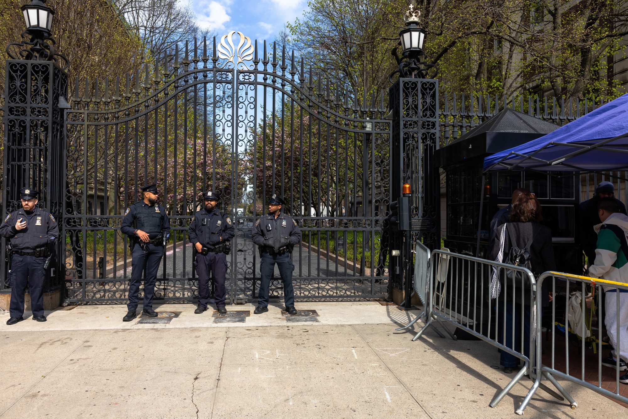 纽约市哥伦比亚大学外警察局警卫在4月24日。摄影师:迈克尔·M·圣地亚哥/盖蒂图片社“增加警察存在让我戴着我的基帕四处走动时感到更安全,而不用把它遮起来,”19岁的扎卡里·辛格曼说。“对于闯入汉密尔顿大厅的人,需要有一定程度的后果。”