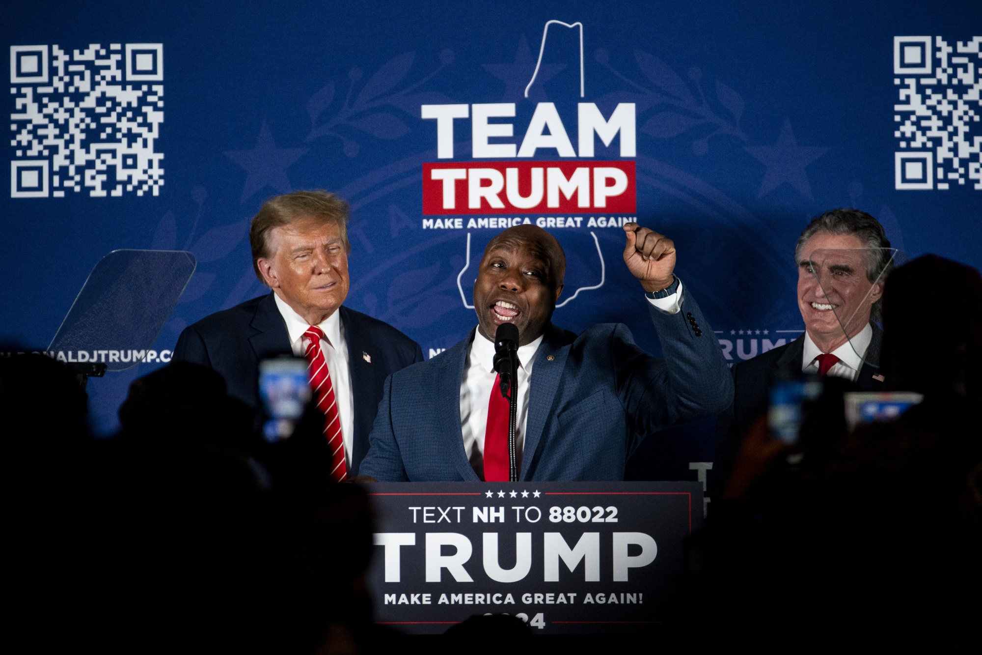 南卡罗来纳州共和党参议员蒂姆·斯科特(Tim Scott),中间,与前美国总统唐纳德·特朗普(Donald Trump),左,以及北达科他州州长道格·伯格姆(Doug Burgum),右,在一月份于新罕布什尔州拉科尼亚举行的竞选活动中发表讲话。摄影师:Al Drago/Bloomberg