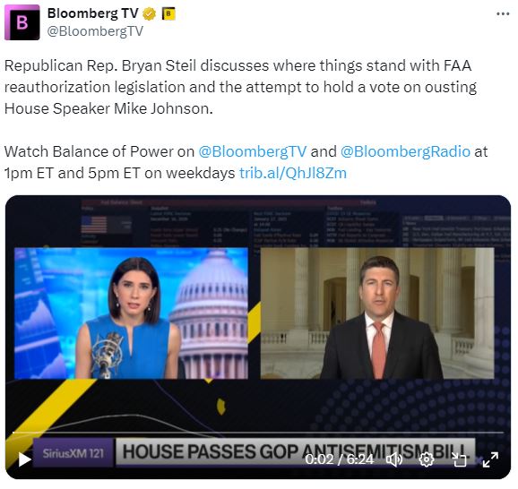 今天在彭博电视台的 权力平衡 早间版节目中,主持人乔·马修和凯莉·莱因兹采访了共和党代表布莱恩·斯泰尔,谈到了联邦航空管理局重新授权立法的进展以及试图就罢免众议院议长迈克·约翰逊进行投票的尝试。