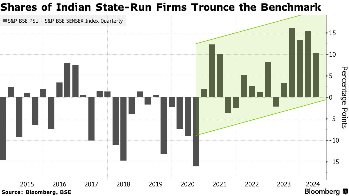 现在,它们的股票正朝着创下连续第四年超越印度基准指数的记录前进,分析师们预测国有企业的股本回报率将达到十多年来的最高水平。