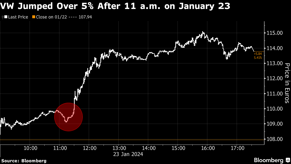 一月份,大众汽车的股价在与分析师通话的早晨飙升。MM Warburg & Co.的法比奥·霍尔舍当天与该公司交谈,他说这些信息并不新鲜。