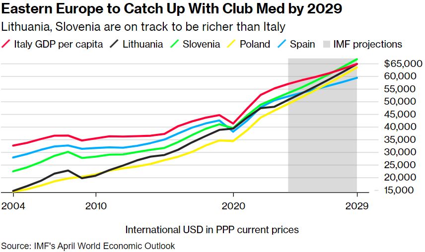 * 人均收入根据IMF的预测,斯洛文尼亚的人均收入将在2029年在购买力调整后超过意大利。立陶宛将在这一指标上赶上,而波兰也不会落后太远。