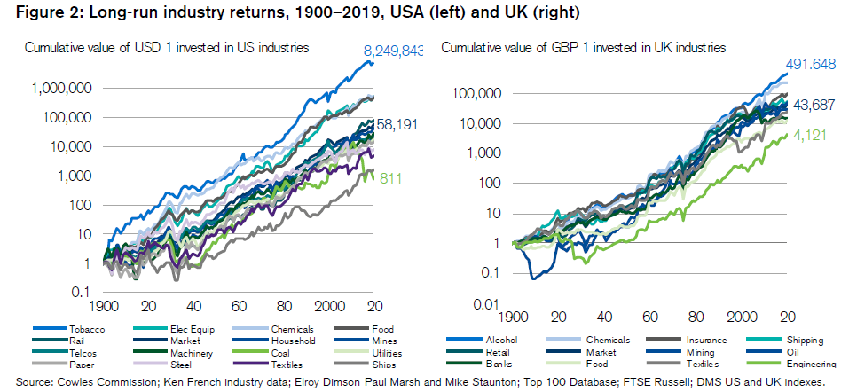1978年,还有几十年。摄影师:Prensa Latina/AFP但这些是针对理性行为者的特例,他们有明确的行动方向来摆脱制裁。更广泛的历史表明,排除罪恶股票并没有任何效果,除了让道德不太谨慎的投资者赚取更多的钱。宗教投资者几代人一直在排除酒精股票;在20世纪,烟草几乎成为许多人不愿接触的对象。然而,英国学者埃尔罗伊·迪姆森(Elroy Dimson)、保罗·马什(Paul Marsh)和迈克·斯坦顿(Mike Staunton)发现,酒精股票是英国本世纪表现最好的行业,而烟草在美国表现最好(因为在禁酒时期,酒精股票被强制暂停)。以下是来自2020全球投资回报年鉴的图表: