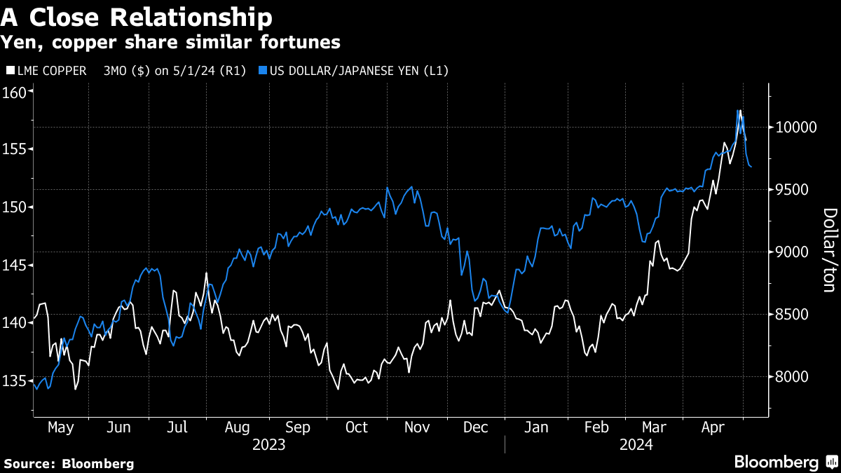 他们补充说,最新的伦敦金属交易所交易员承诺报告证实,投资者推动了上涨,商业头寸下降占开仓利息的比例。除了中国之外,这种金属的命运也与日元有关。铜周一的上涨得到了日元走强的帮助,随着日本当局据称的干预效果减弱,铜价再次下跌。花旗研究人员在最近的一份报告中认为,即使是短暂的干预也对更广泛的金属复合体是一种福音。