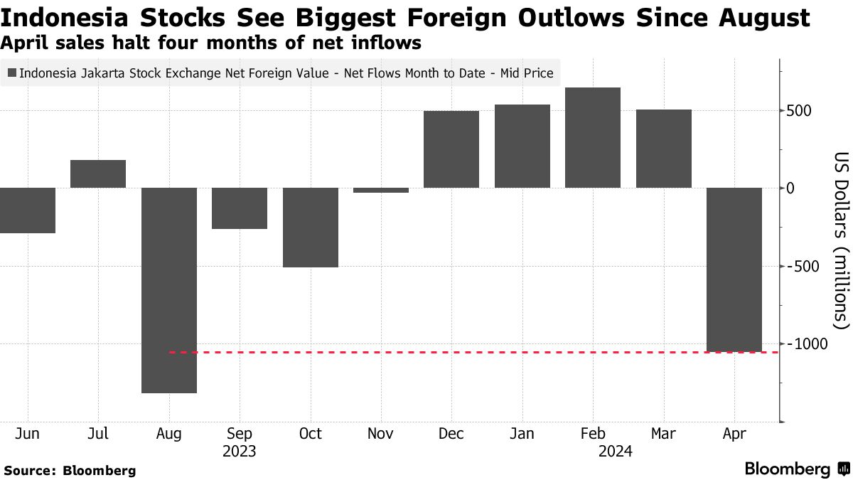 根据印尼证券交易所发布的数据,海外投资者在四月份从印尼股市撤出了超过10亿美元,结束了为期四个月的资金流入。五月份净卖盘持续,投资者更青睐其他市场。