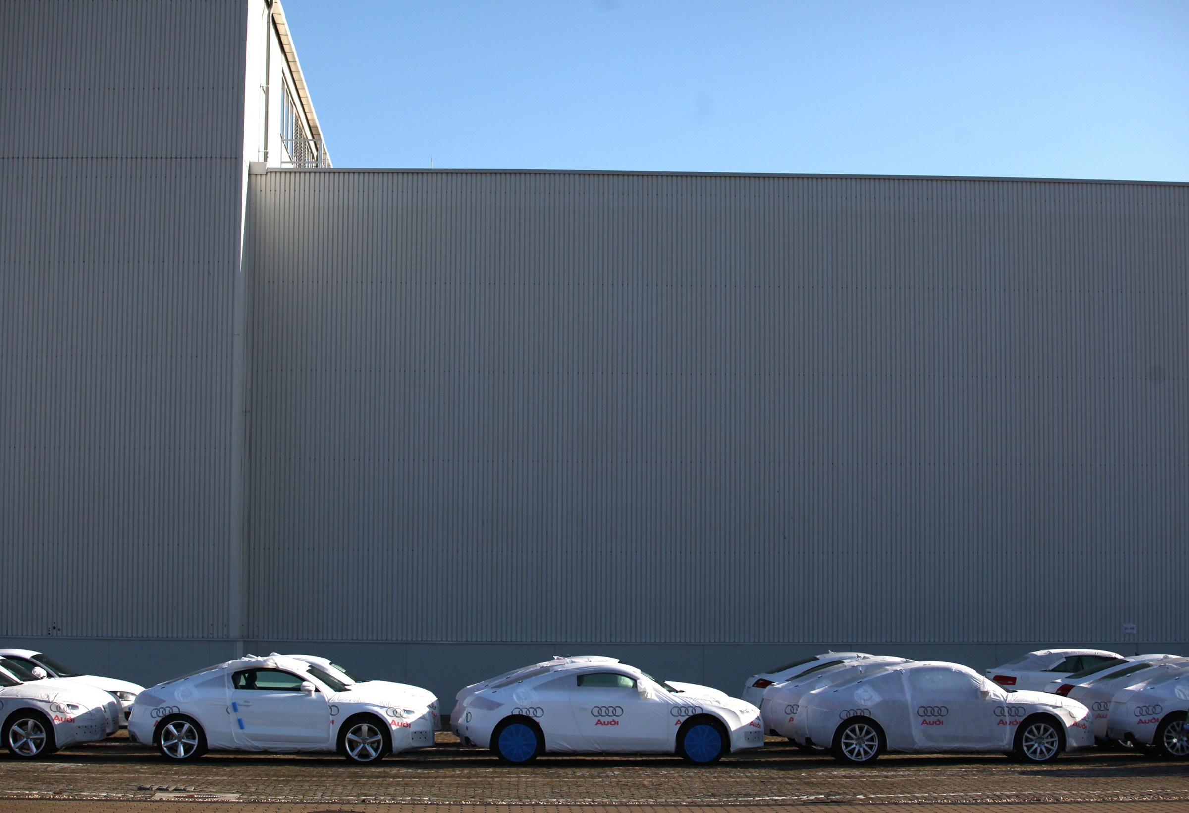 2009年,新奥迪TT车辆包裹在保护罩中,停放在匈牙利杰尔工厂外。摄影师:Balint Porneczi/Bloomberg### 周边地区