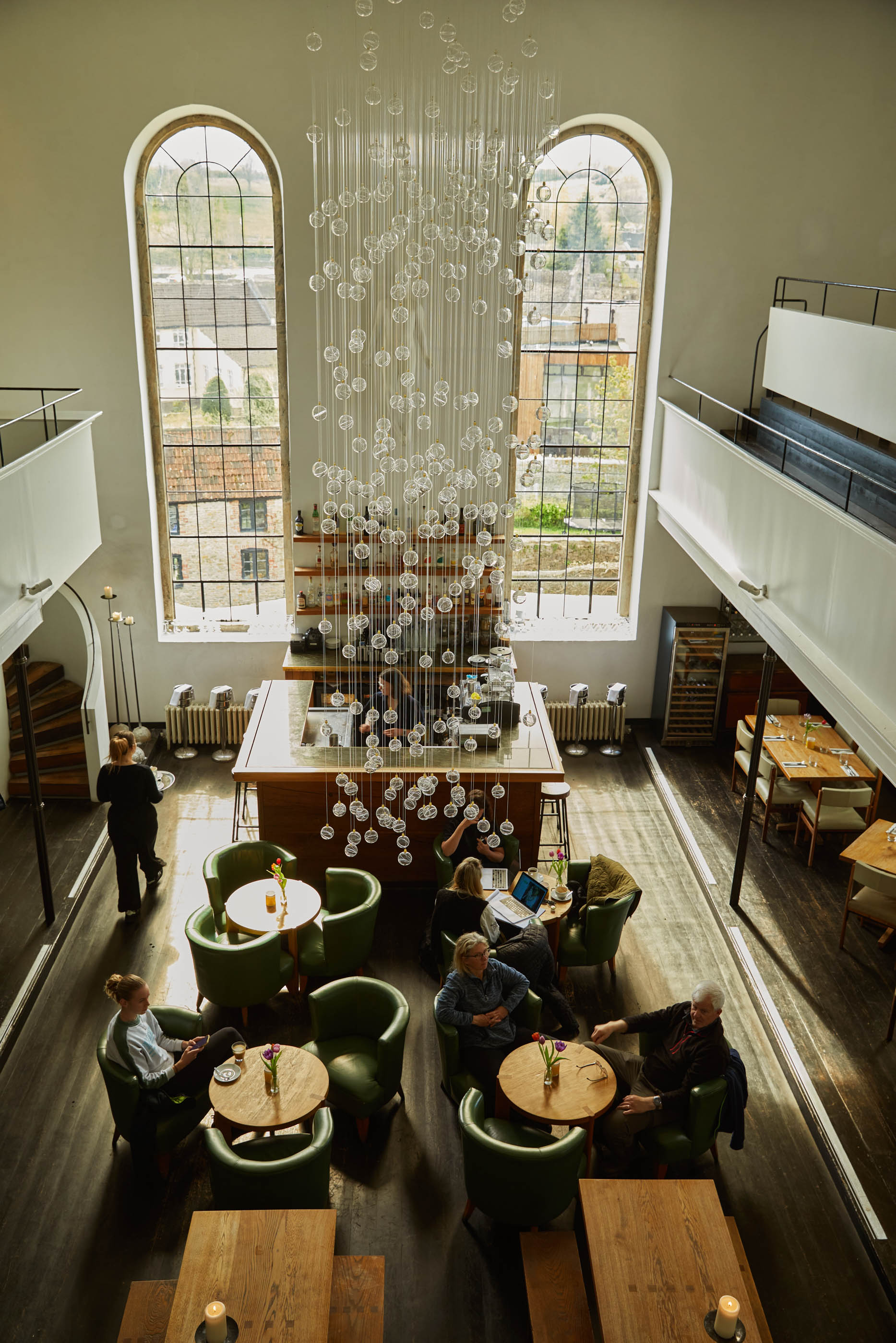 在布鲁顿的一家名为The Chapel的面包店和餐厅。摄影师:Emli Bendixen,为彭博商业周刊拍摄从巴特科姆到布鲁顿早餐时我们第一次品尝了萨默塞特苹果汁,以其酸涩而复杂而闻名,然后我们借了雨靴,漫步到该地区最获奖的奶酪厂Westcombe Dairy,品尝了熏制和陈年切达奶酪。Westcombe有一个引人注目的设施,有谷仓门、天窗和一个小农贸市场;当我们与工作人员聊天时,村里的当地人也来了。我们带着两袋装满苹果酒和奶酪的购物袋离开,前往布鲁顿,沿着路走了3英里。