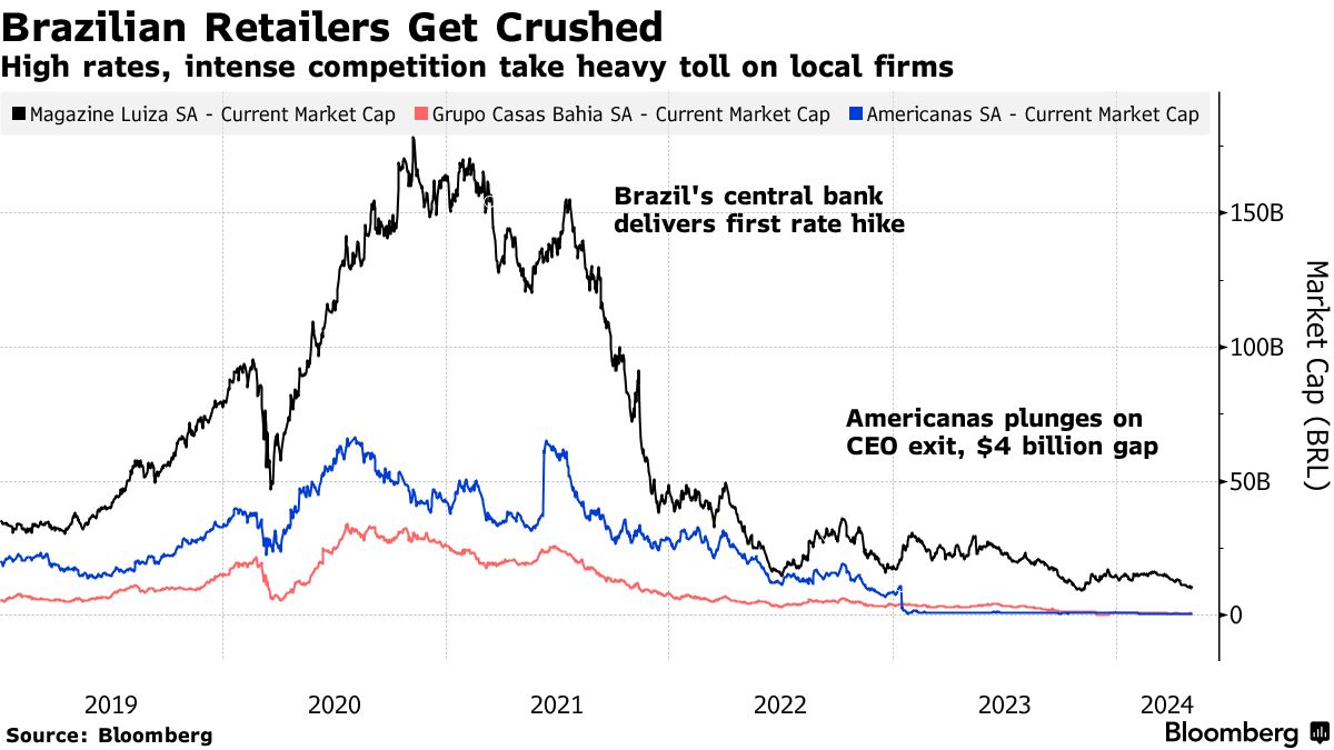 曾经由亿万富翁支持的蓝筹股主导,巴西的零售行业正摇摇欲坠。许多本地运营商在与全球电子商务巨头竞争时在数字平台上投入巨资,现在也在抵御亚洲快时尚公司Shein和Sea有限公司的Shopee。