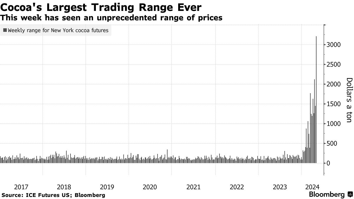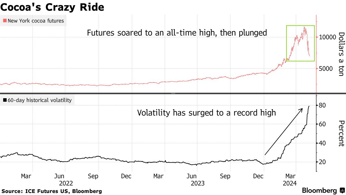 这种回调标志着可可的明显转变,它变得比铜还要昂贵。由于西非的欠收成导致全球面临第三年的短缺,价格飙升,给买家带来压力,使巧克力价格更高。但这场疯狂的波动也使交易者维持头寸变得更加昂贵,促使许多人放弃。