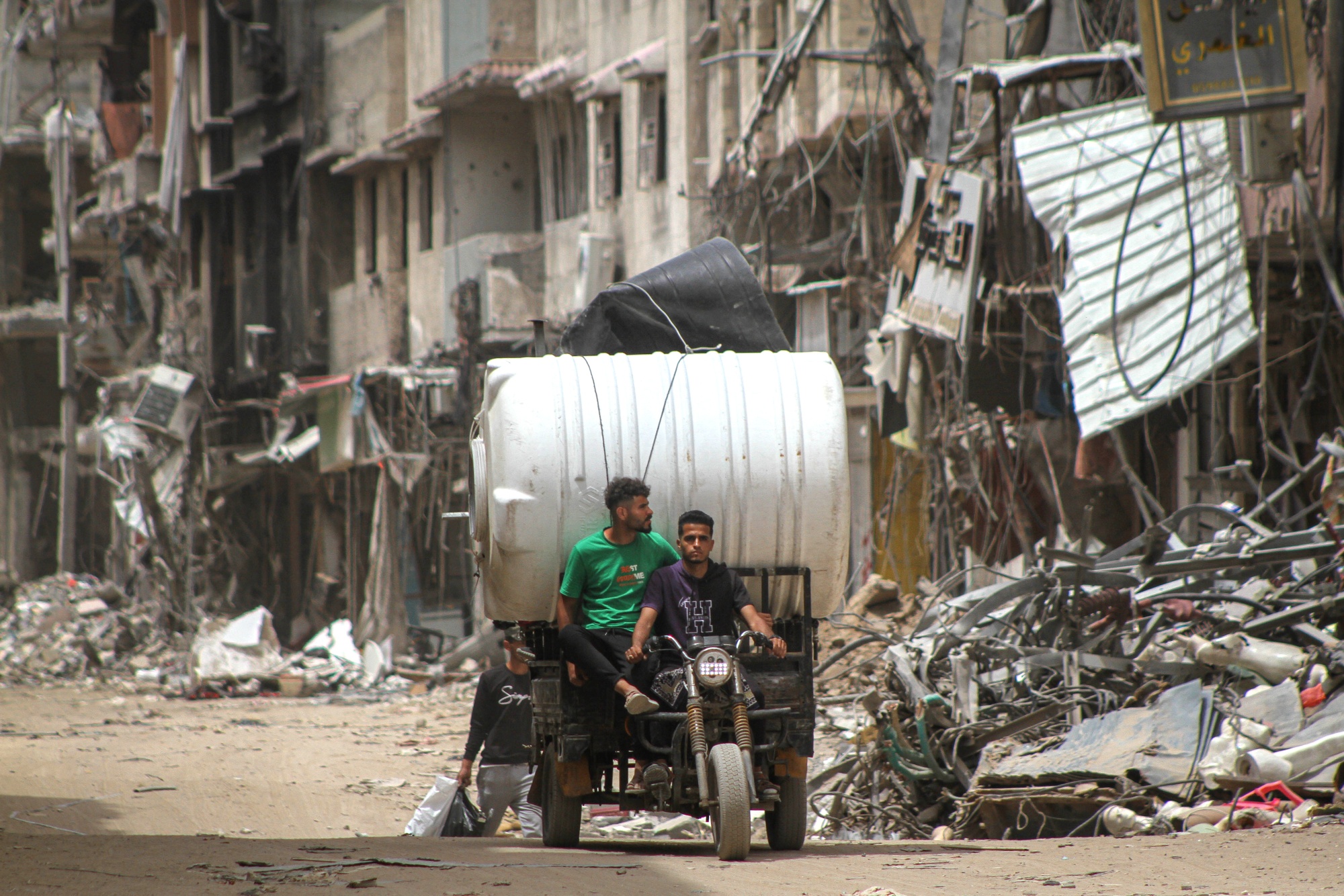 巴勒斯坦人在4月26日在加沙南部汗尤尼斯运送水容器。摄影师:Ahmad Salem/Bloomberg### 全球必读