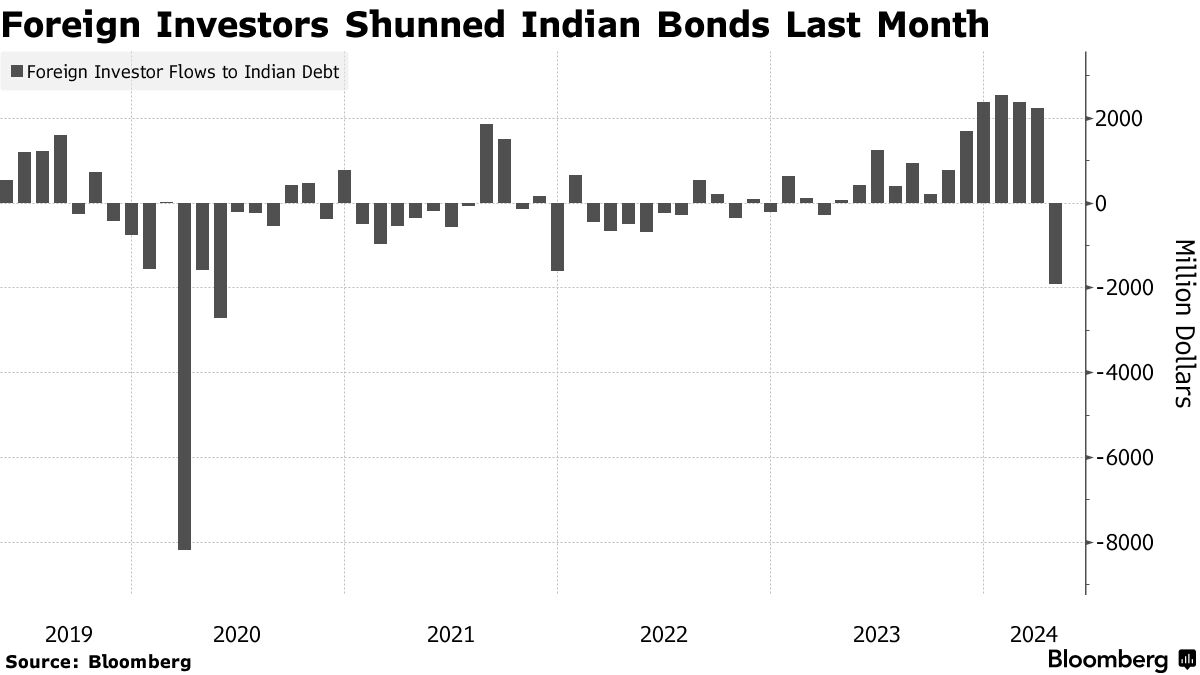 外国资金在四月份抛售了印度债券的最大金额,自疫情爆发以来,对美联储长期高利率的担忧促使交易员减少了对将债券纳入全球指数的热情。