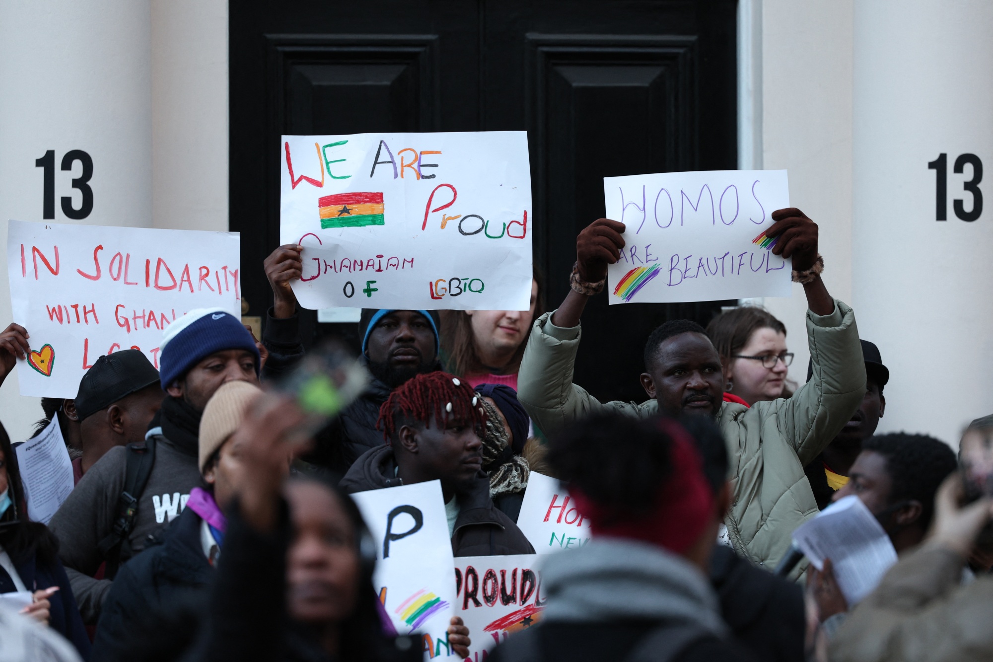 人们聚集在伦敦的加纳高级专员办事处外抗议加纳反LGBTQ+法案,时间是3月6日。