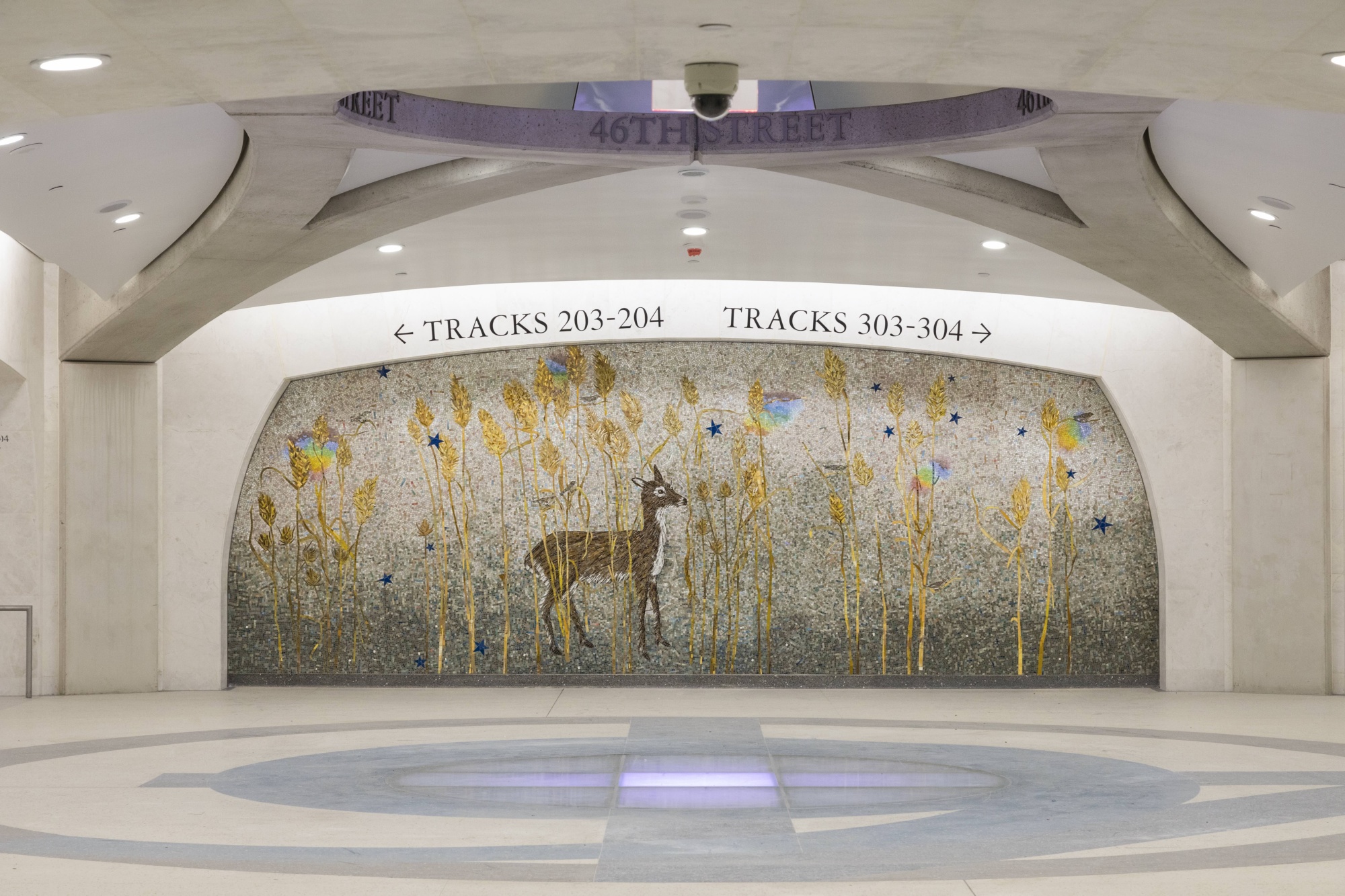 当长岛铁路通勤者第一次看到大中央麦迪逊时,他们看到了一个价值111亿美元的通勤火车站,位于2023年1月在曼哈顿中城开放的大中央车站地下,他们被迎接了一系列设计亮点。除了宏伟的建筑外,这座占地70万平方英尺的设施还设有艺术家Kiki Smith创作的五幅大型自然主题玻璃马赛克,车站大厅层有一幅长120英尺的马赛克由草间弥生创作,以及其他艺术家的几个数字装置。