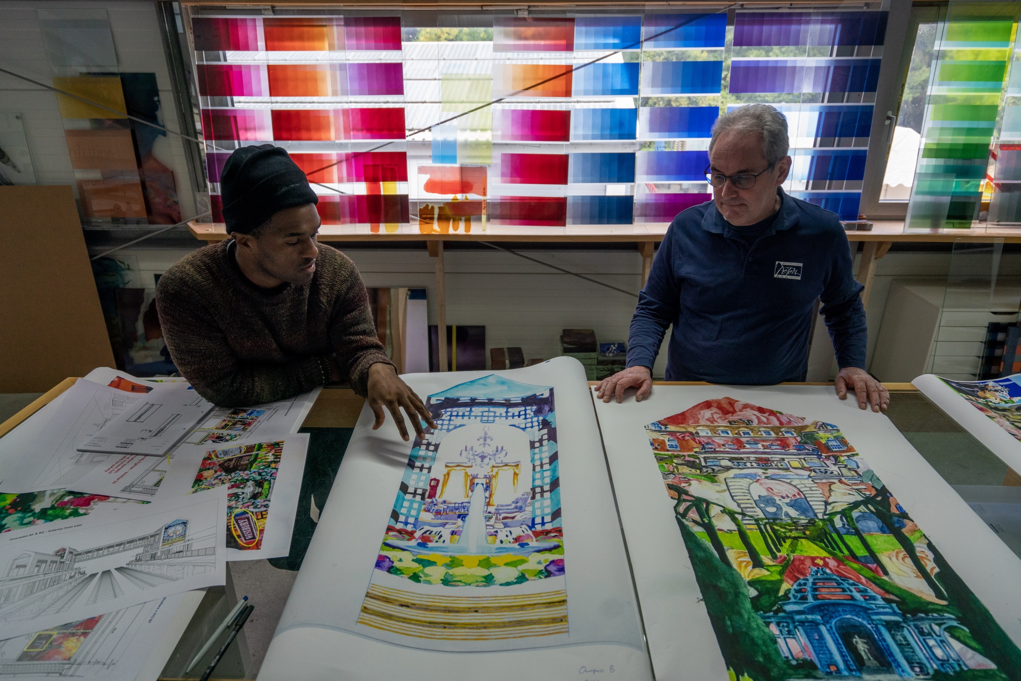艺术家达里尔·韦斯特利与格拉斯马勒雷·彼得斯工作室合作,将他的作品翻译成了绘制在LIRR Westbury车站玻璃上的作品。由格拉斯马勒雷·彼得斯工作室提供我们向艺术家提供了关于他们将要为之创作艺术品的地方的大量信息,但他们需要自己对这一切进行解释。我们要求选择小组从众多提交提案的艺术家中挑选出四位入围者。然后选择委员会选择他们认为最能代表社区、对位置有意义并且能引起使用该车站的人共鸣的提案。达里尔·韦斯特利的作品为翻新后的Westbury LIRR车站提供了很好的例子。他通过广泛的研究捕捉了这个地方的本质,这导致了一个色彩斑斓的玻璃装置,展示了Westbury的地标和历史。这真的改变了这个地方。