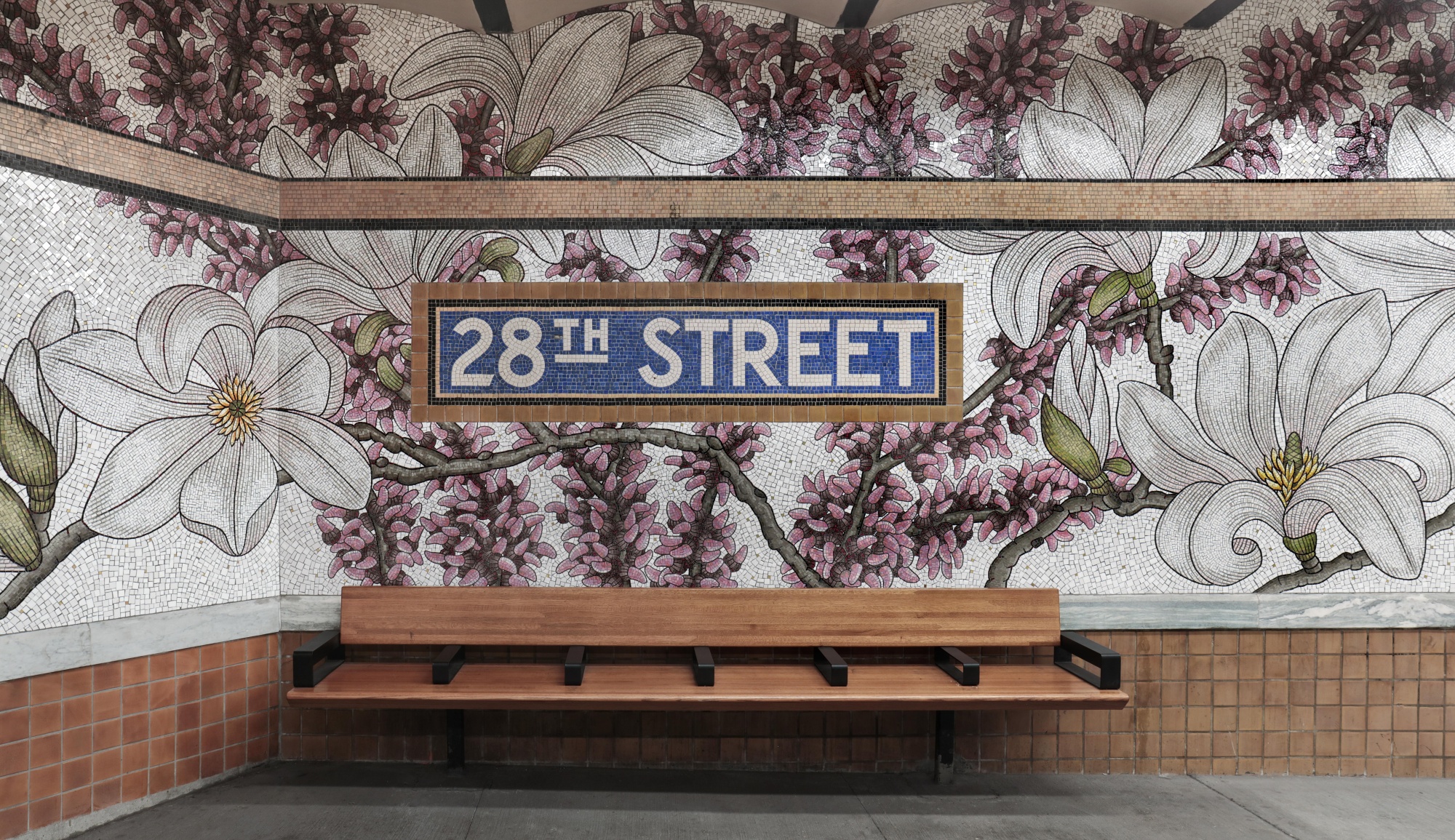 南希·布卢姆在28街站的玻璃植物壁画融入了现有的马赛克标识,并向附近的麦迪逊广场公园致敬。保护协会的多年生植物收藏。照片:凯西·卡弗设计准则还强调不仅要保留而且要加强翻新站点的历史元素。艺术与设计在这些站点翻新中的一个很好的例子是在28街站,南希·布卢姆的作品将她的艺术作品与该站的美学和历史融为一体。该站是1904年开放的最初的地铁站之一,大片马赛克是由美国烧蜡瓷砖公司根据原始建筑师海因斯和拉法基的设计制作的。这些马赛克在1980年代中期被商业马赛克取代。新的金箔穆拉诺马赛克被安装,强调了以新方式展现的原有元素。南希的花卉图案与附近的麦迪逊广场公园的植物群有关,以及该地区作为蒂芙尼玻璃公司总部的历史。制造商根据南希的色彩研究将其转化为当代马赛克。