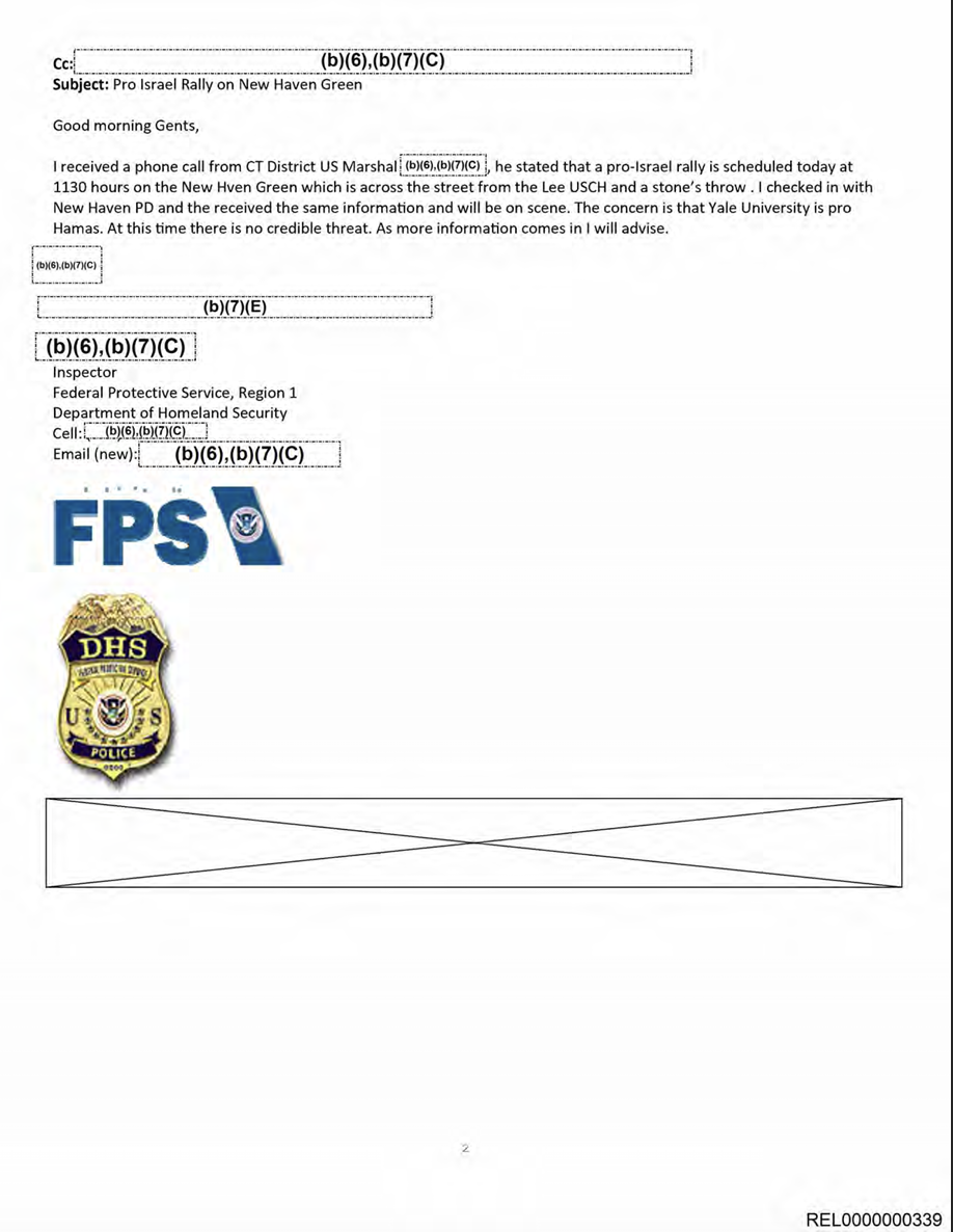 点击这里查看文件(第19页)还担心涉及大学校园的示威可能会导致暴力事件。在一封电子邮件中,一名检查员标记了一个计划于10月13日在康涅狄克州纽黑文的纽黑文绿地举行的支持以色列集会,该地点位于纽黑文联邦法院对面。“担心的是耶鲁大学支持哈马斯,”检查员写道。但“目前没有可靠的威胁。随着更多信息的到来,我会提供建议。”