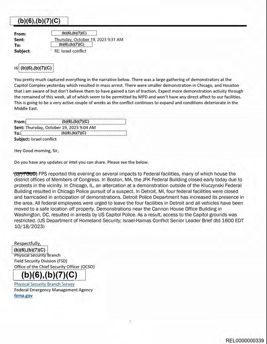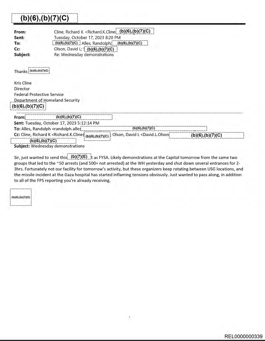 哈马斯去年十月袭击以色列南部后,我提出了一项FOIA请求,想看看这些抗议活动是否引起了机构的关注。FPS回应称几乎提供了100页的电子邮件、照片和视频。这些记录展示了联邦对早期示威活动的幕后反应,并展示了政府在监视抗议者方面变得越来越复杂。它们还描绘了官员们深深担心示威活动会变得暴力。