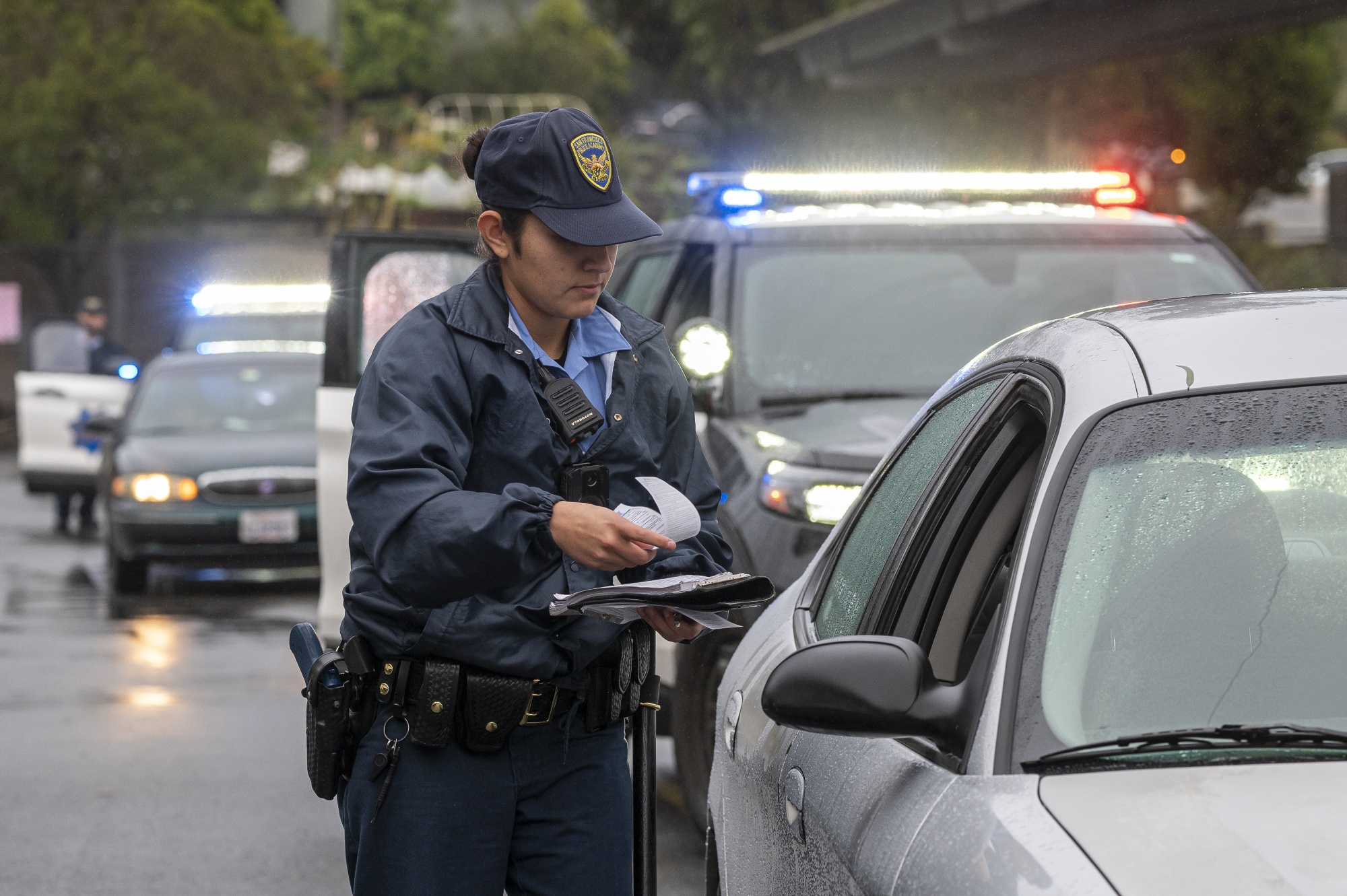 2023年,一名警察新兵在旧金山警察学院外练习交通拦截。对交通执法政策的微小改变可能对道路安全产生重大影响。