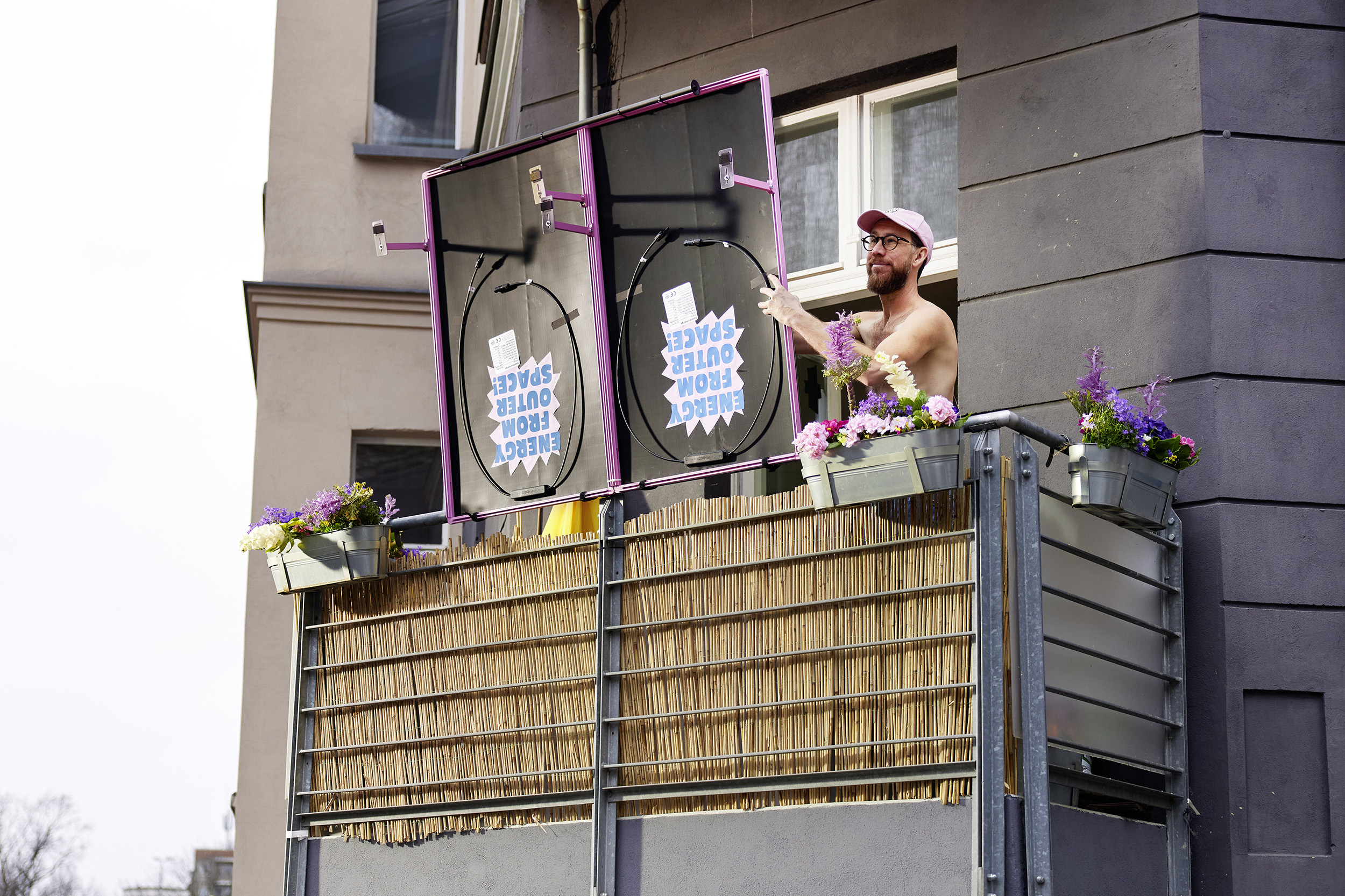 艾因霍恩创始人瓦尔德马尔·齐勒(Waldemar Zeiler)在柏林的公寓阳台上挂着太阳能电池板。摄影师:马丁·奥尔泽·巴尔孔