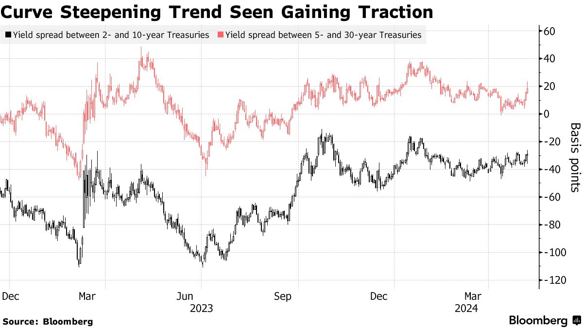 如果美联储开始削减并且市场在较软的数据中定价更多的宽松政策,那么将会出现更陡峭的曲线。这将导致美国两年期收益率下降速度快于较长期的基准。对于长端的潜在买家来说,真正的回报在于通货膨胀将会趋于稳定,从而使长端加入前端主导的反弹行情。