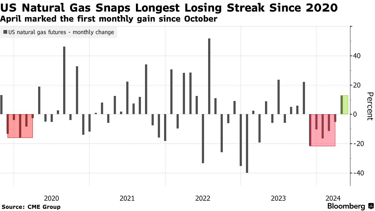 美国天然气价格曾因北美异常温和的冬季抑制需求而暴跌,现在正在回升。四月份是自十月以来首次月度增长,打破了四年多以来最长的跌势。市场预计更炎热的天气即将到来,随之而来的是对天然气的需求增加,因为家庭和企业会开启空调,这会增加对天然气发电厂的负荷。
