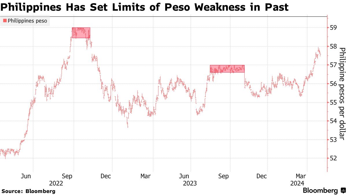 菲律宾央行过去采取了一种战略,即明确其对货币贬值的容忍度。它成功地将比索的跌幅限制在2022年底的创纪录低点59。官员们还表示,他们在9月份干预以捍卫比索兑美元57的水平。