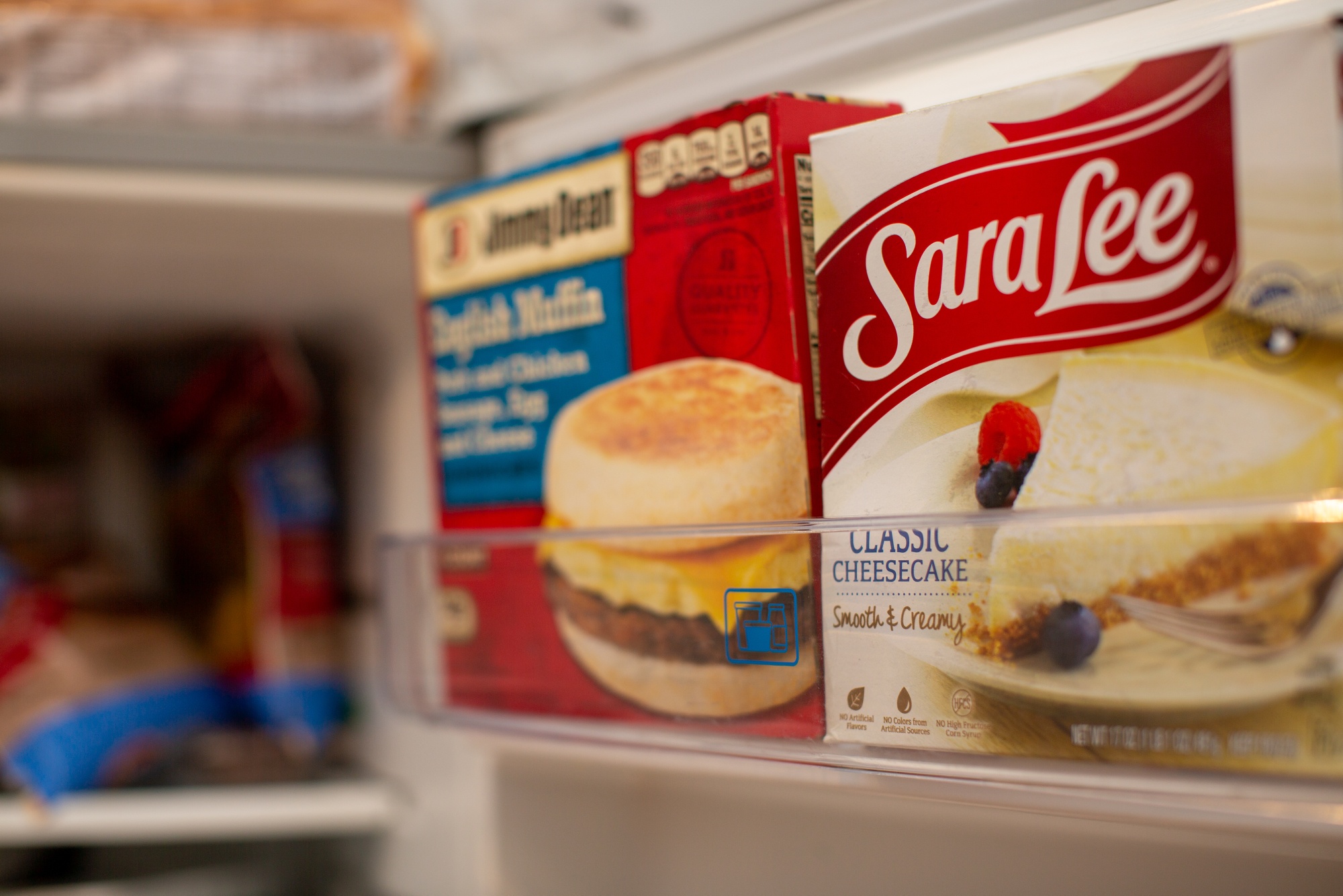 一包泰森食品莎拉·李品牌的奶酪蛋糕和吉米·迪恩英式松饼早餐三明治。