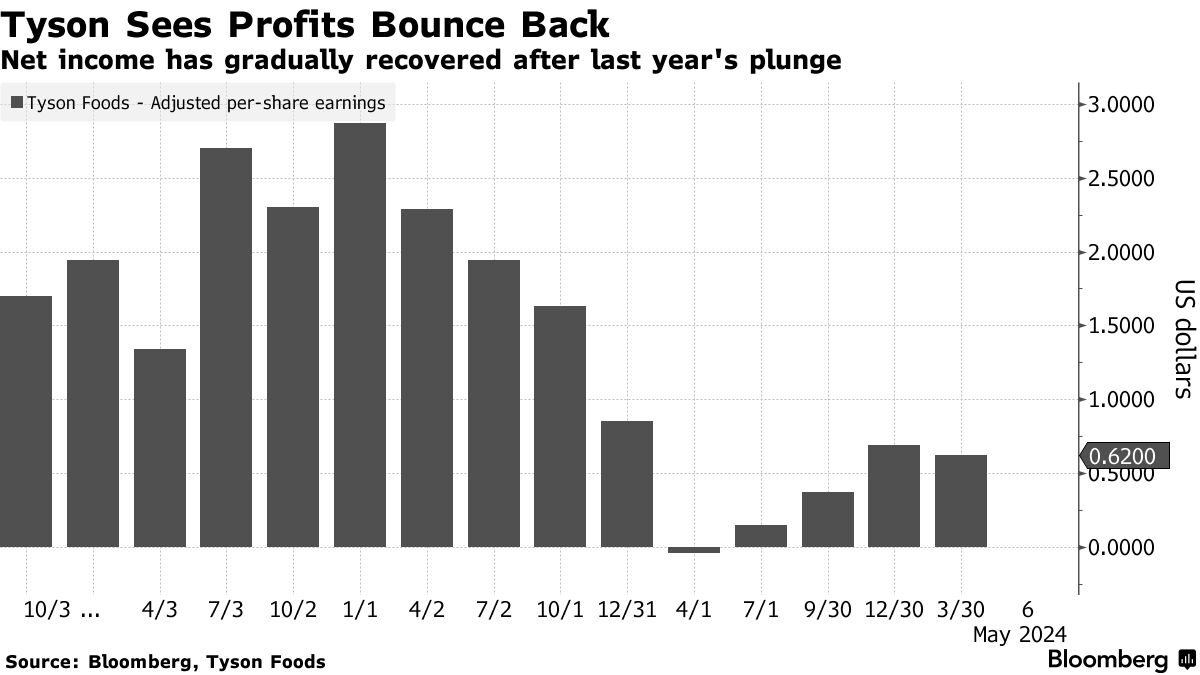 高管们所描绘的略显阴暗的前景掩盖了泰森超出预期的第二季度业绩。泰森在周一的一份声明中表示,截至3月30日的三个月调整后的净收入为每股62美分,扭转了去年同期每股亏损4美分的局面。这一结果甚至超过了彭博社汇编的分析师预期的最高值。该公司还提高了其调整后的营业利润预期,称其鸡肉业务的表现有所改善。