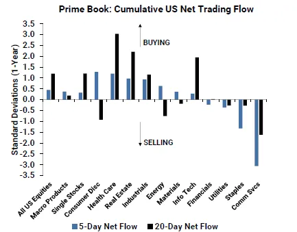 总体而言,对冲基金连续第三周净买入美国股票,但速度有所放缓。其他净买入的行业包括医疗保健、工业和信息技术。相反,通信服务是美国净卖出的行业,其次是日用消费品、金融和公用事业。