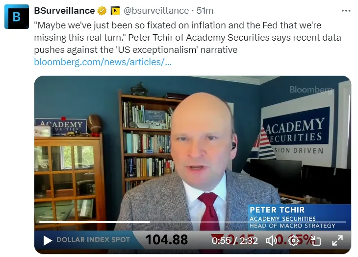 “这种对美国例外主义的整体看法,以及它在市场中显现出来,我认为是一个我们依然执着于的旧故事,”Tchir今天在监测中说道,详细阐述了他在一份研究报告中所宣称的,“我希望我的例外主义是例外的。”