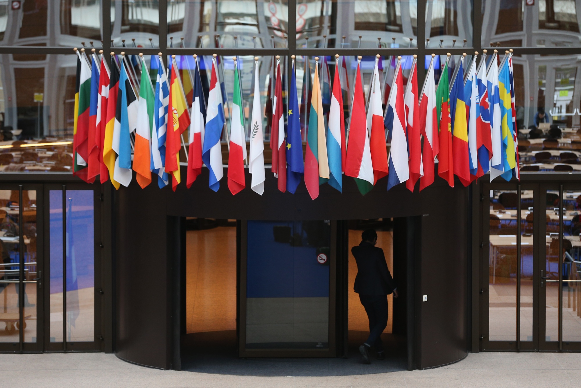 欧盟成员国的国旗在比利时布鲁塞尔欧盟理事会的Lex大楼前。