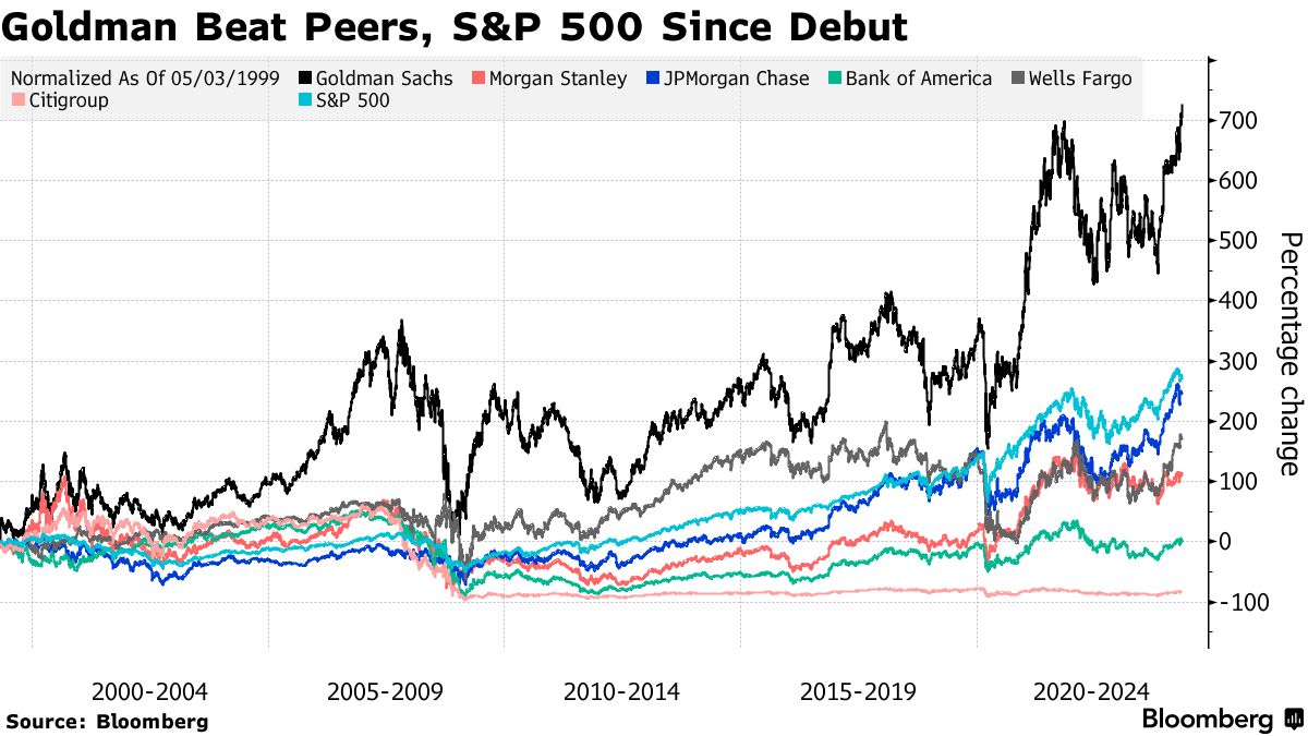 自那时以来,高盛经历了多次变化——在首席执行官、办公室等方面——尽管它仍然是行业中最大和最成功的堡垒之一。高盛的股票最近创下了 新高,周五收于438.18美元,今年上涨了14%,是1999年5月以53美元出售股票的8倍多。。在作为上市公司的时代,高盛的股票表现优于竞争对手,即使这家银行经历了许多波折。
