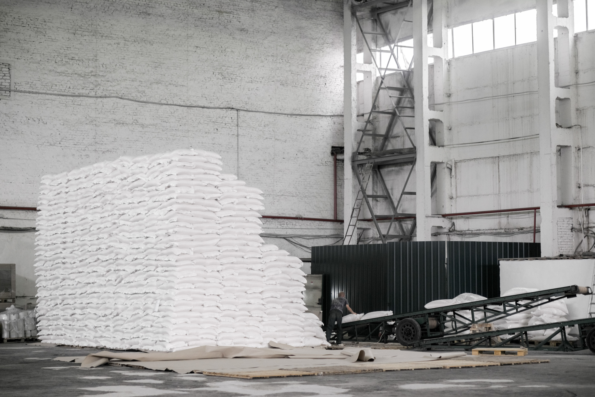 工人们将精炼白糖装入乌克兰尼古拉耶夫的ED&F Man炼油厂的电梯。