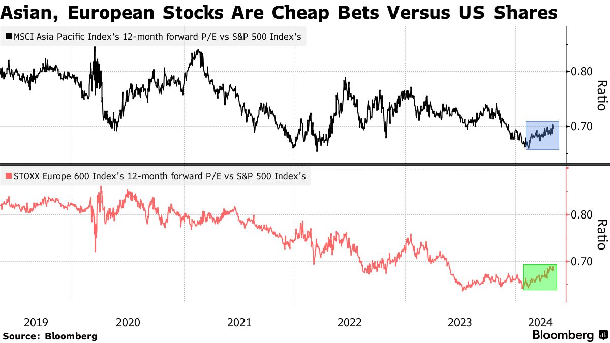 虽然美联储降息的延迟给亚洲中央银行和外资流入带来压力,但区域经济受到相对较低的通胀水平的支持。估值也对亚洲有利。 MSCI亚太指数的交易倍数约为14倍预期收益,类似于欧洲的基准,而标准普尔500指数的倍数接近21倍。