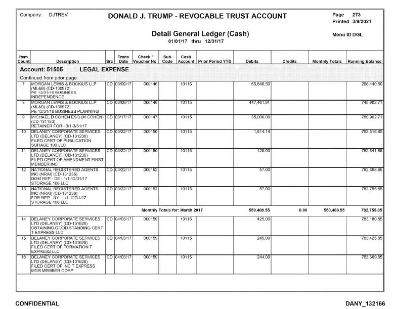 证人还详细描述了如何维护特朗普可撤销信托和个人账户的总账。科恩的付款被编码为“法律费用”,但陪审员被告知法律部门从未被告知律师的发票,这本应是标准做法。