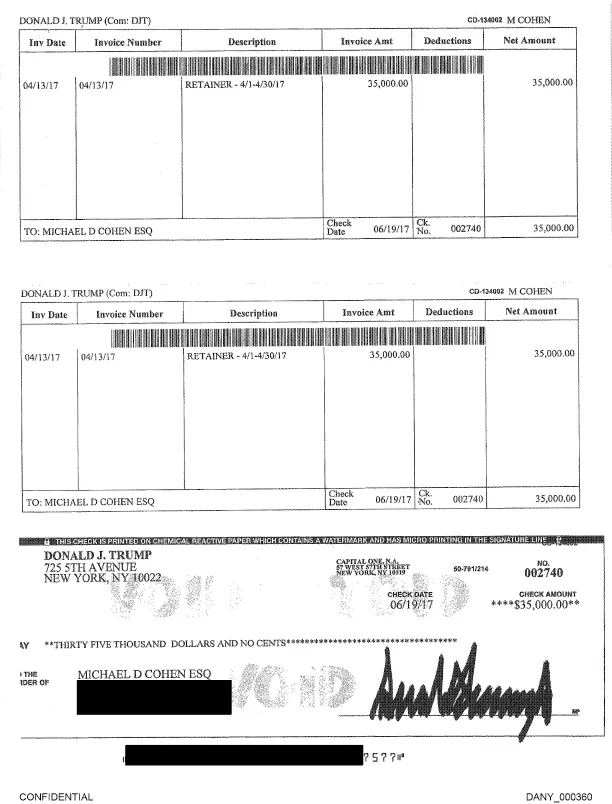 在为期两周的政府证人作证后,陪审员们首次近距离查看了案件中心的那些平凡的商业记录:科恩的每月发票、关于付款的内部电子邮件讨论、公司的总账条目,以及最终,特朗普在赢得选举后从白宫签署的个人支票。