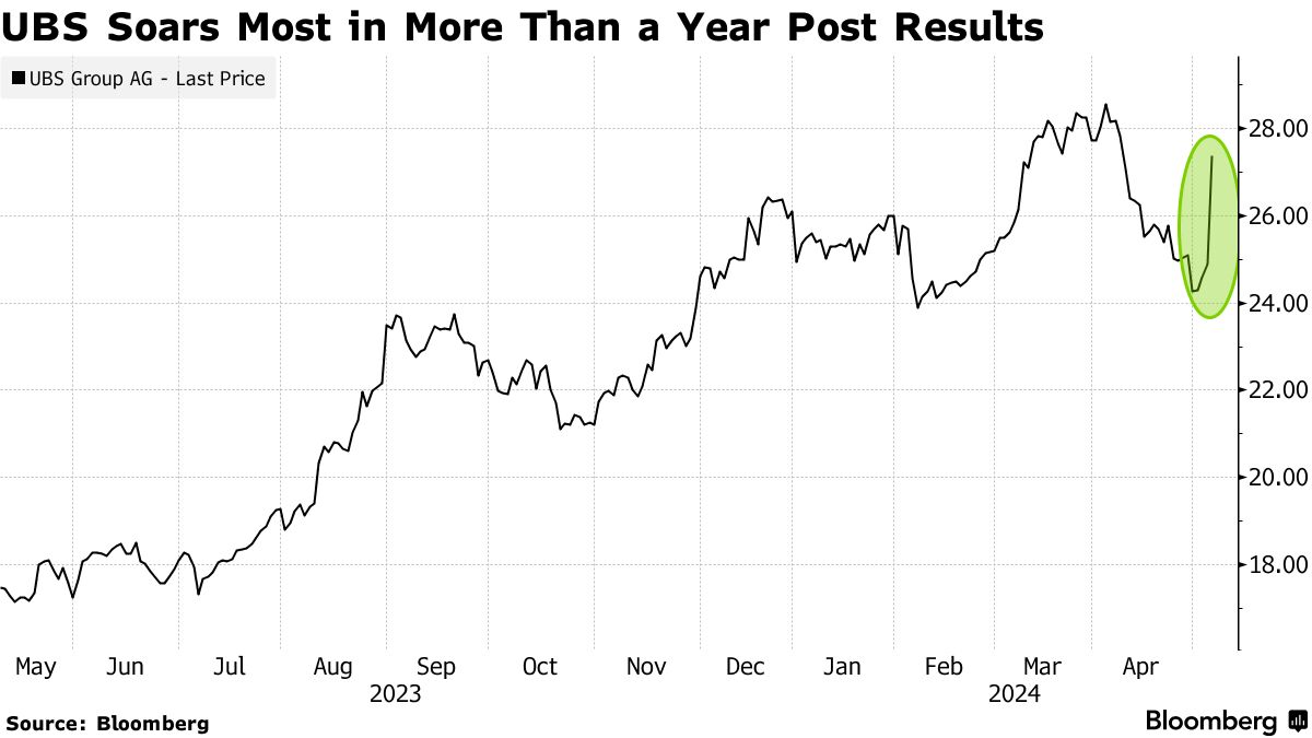 在发布后,瑞士联合银行股价飙升,截至苏黎世时间上午11:40上涨9%,是自2023年3月21日收购协议达成以来的最大涨幅。