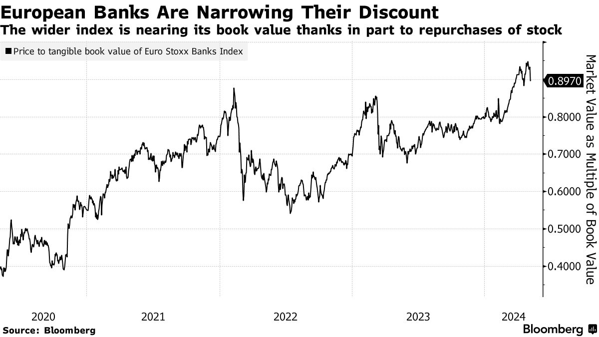 自疫情以来,欧洲银行已经反弹,因为监管机构解除对股东分红的限制,行业利用回购迅速分配多余资本。然而,过去两年使银行成为欧洲股票中表现最佳的公司的估值提升,也使得回购股票的吸引力降低。