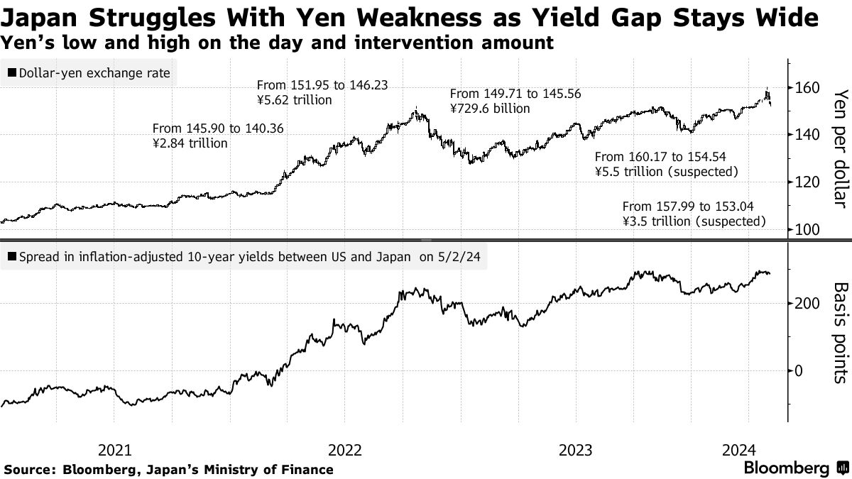阿尔文·谭,RBC资本市场在新加坡的亚洲外汇策略负责人,同意由于收益差距,日元可能会走向160,并且“如果美国利率不下降,干预的影响将很快消散,”他在周一的彭博电视上表示。