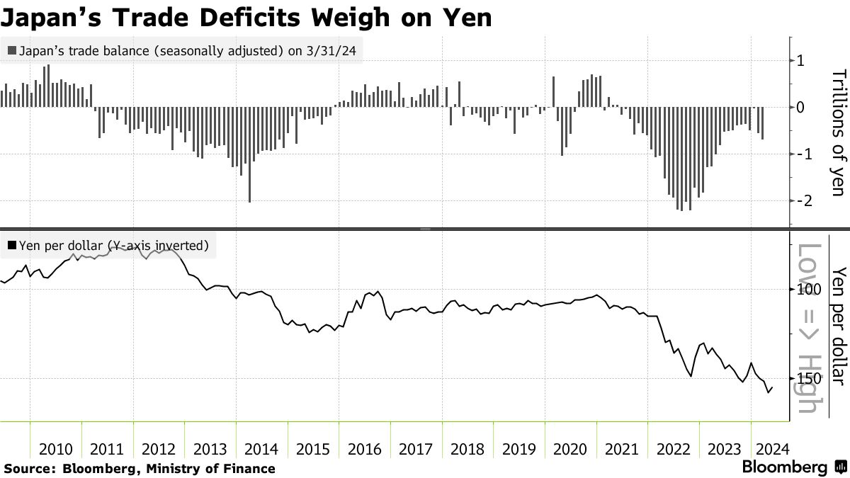 当日本在 2022 年 9 月首次进入市场以支持日元时,这帮助推动了该货币对美元的升值超过 10%,一直持续到去年 1 月中旬。这一次,尽管上周有两次疑似干预,RBC Capital Markets 和美国银行等公司的分析师预计,日元将回落至 160 每美元,因为收益差距和贸易赤字对该货币施加了贬值压力。