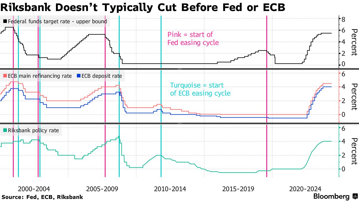 根据彭博社调查的20位经济学家中三分之二的预测,将基准利率下调25个基点至3.75%将标志着本世纪瑞典官员在欧洲中央银行和美国联邦储备委员会之前开始放松政策的首次明确实例。