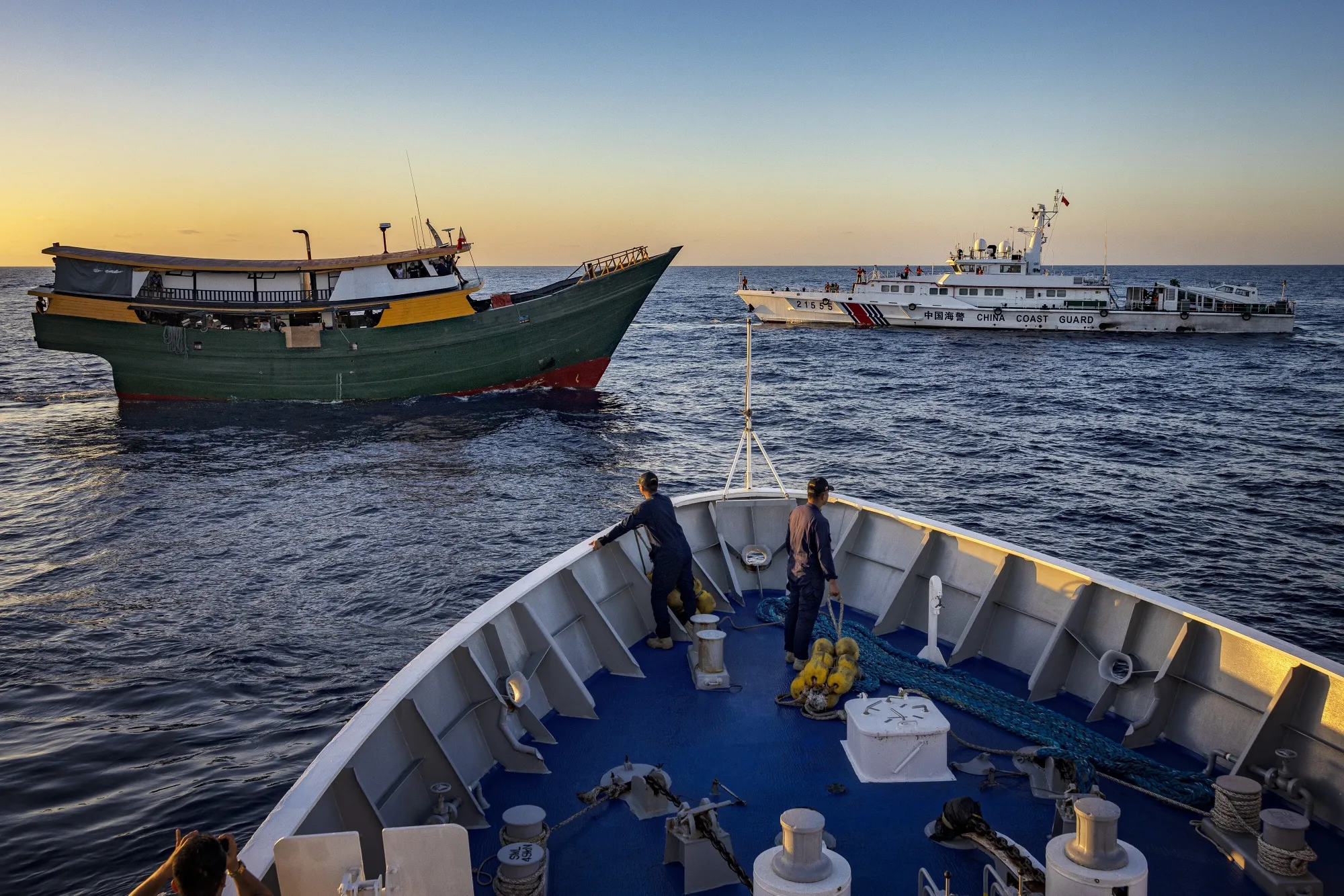 一艘菲律宾海军租用的船只在3月5日进行例行补给任务时,被一艘中国海警船阻挡。摄影师:埃兹拉·阿卡扬/盖蒂图片社美国和菲律宾多次对北京在南海事件中的说法提出异议,同时指责中国传播虚假信息。