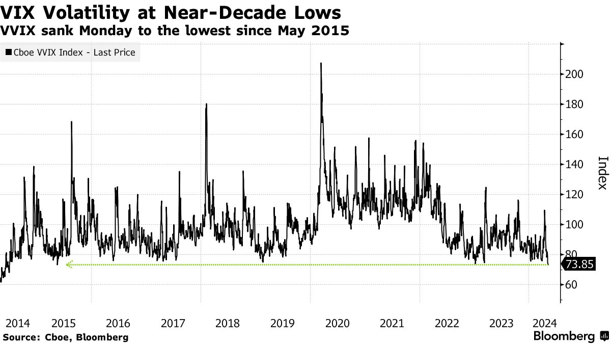 随着Cboe波动率指数——或VIX,它衡量预期的股市波动——在过去几周内下跌,跟踪VIX期权隐含波动率的指数也随之下降,称为VVIX。VVIX在周一的交易中收盘略高于73,这是自2015年5月以来的最低收盘值。在周二的早盘交易中,该指数仅小幅上升,远低于其一年的平均值89。